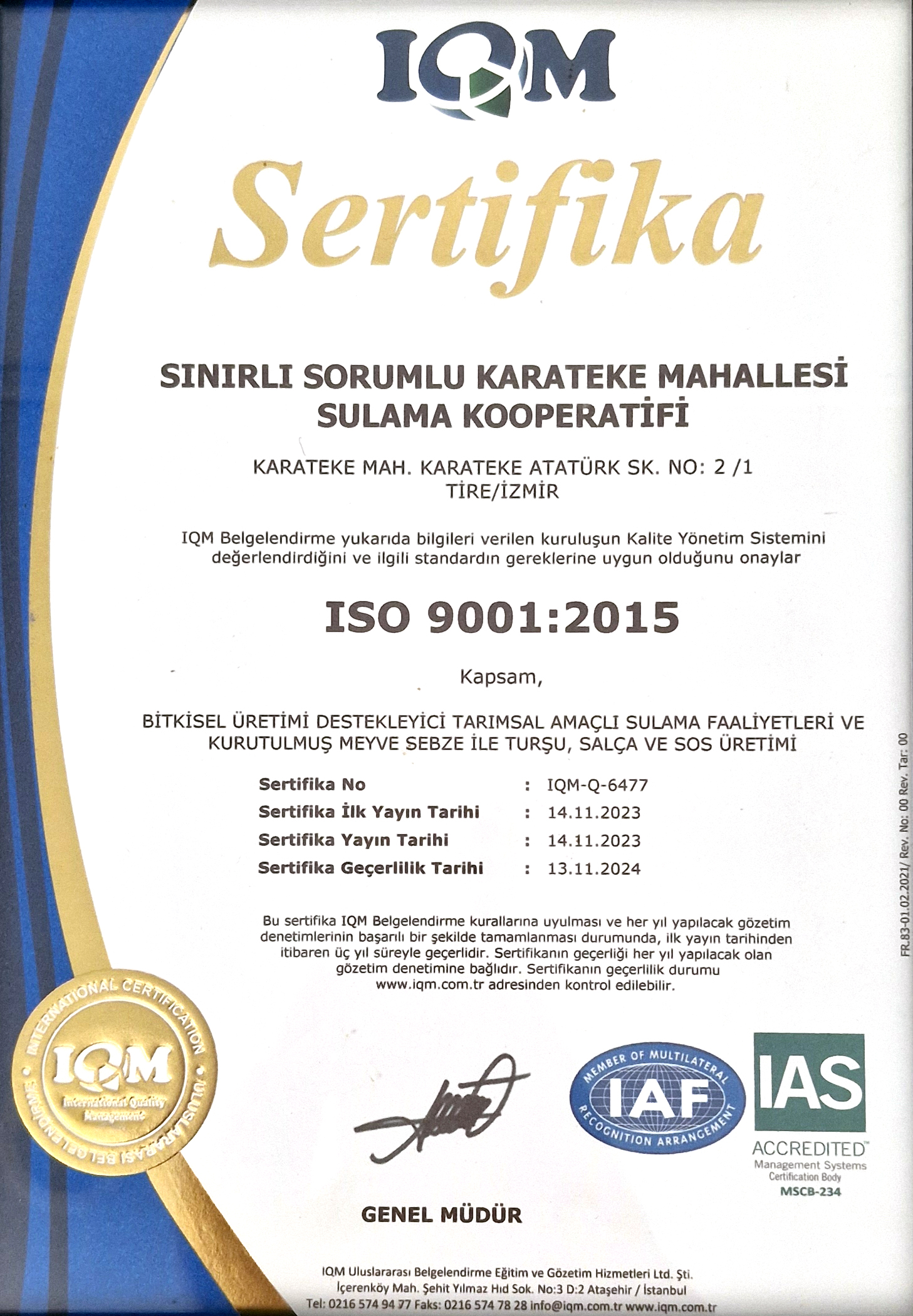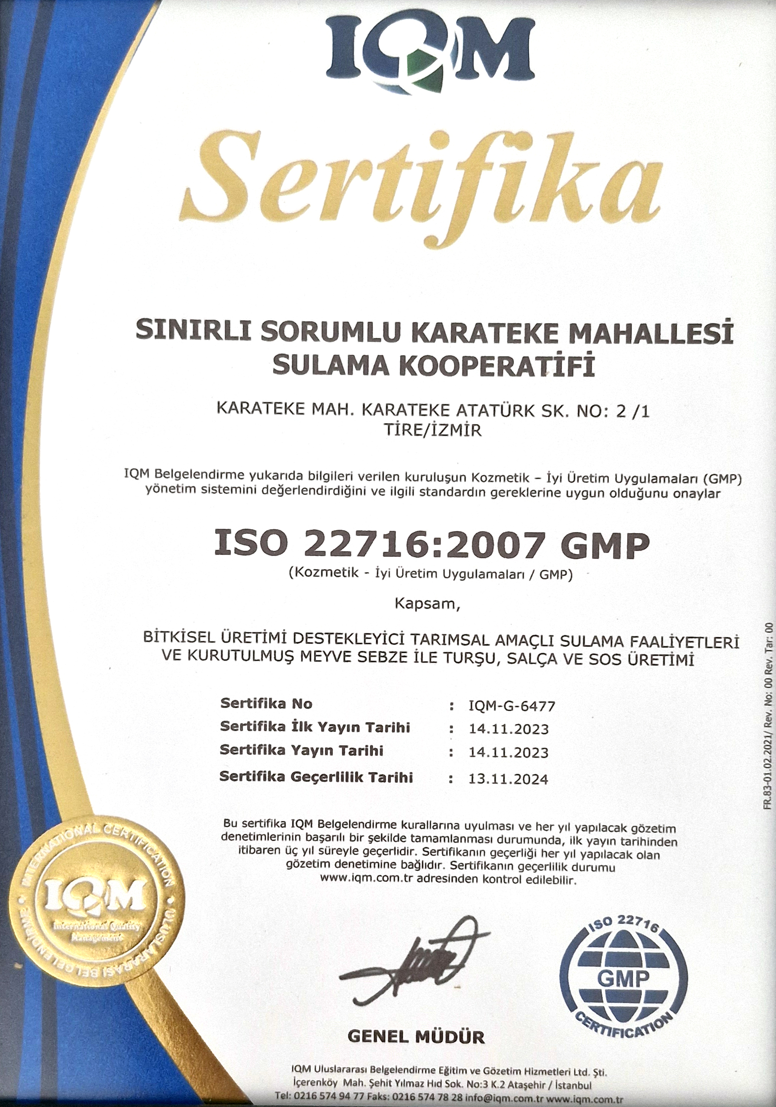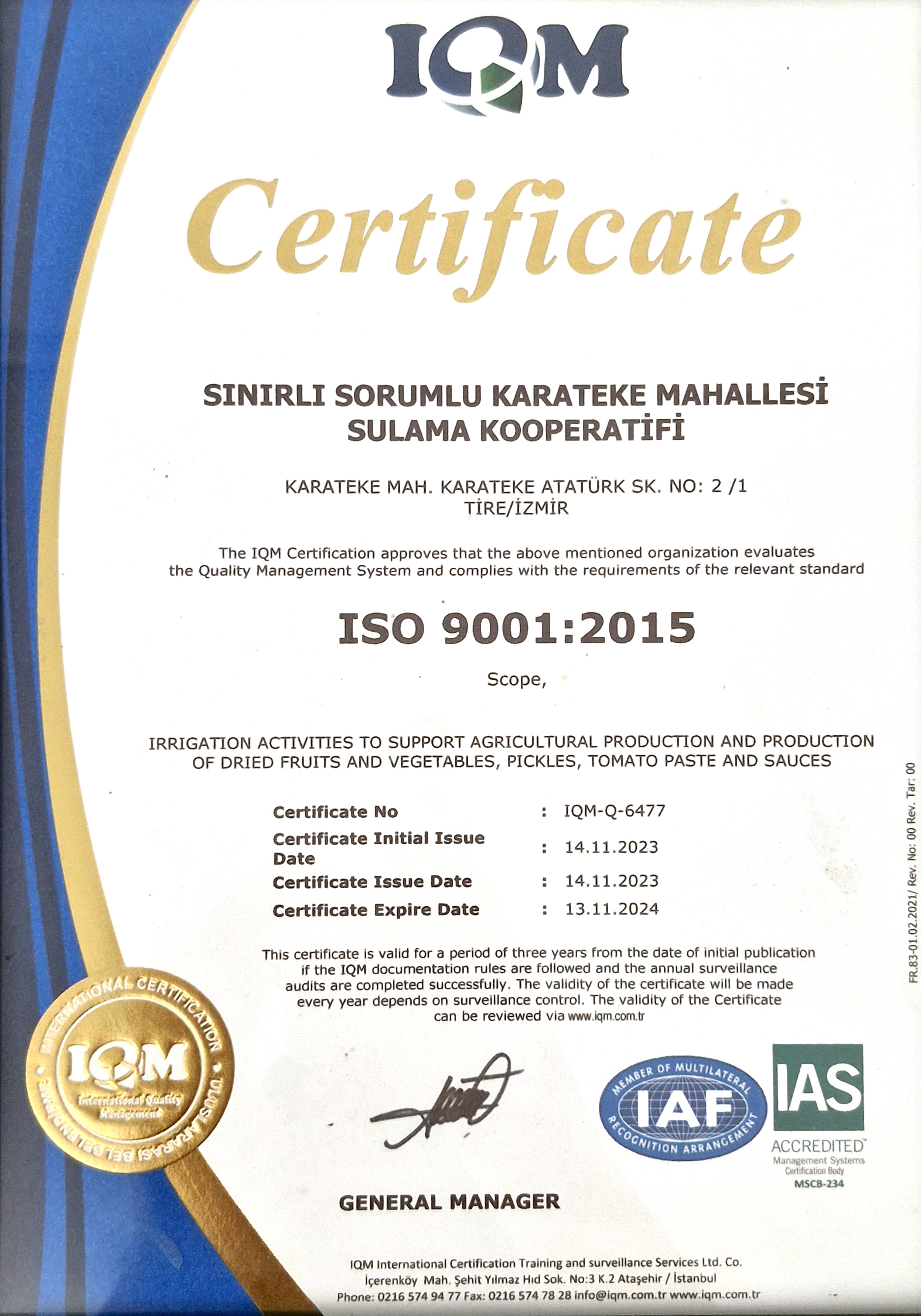 Karateke Mahallesi Sulama Kooperatifi olarak, ortaklarımıza daha kaliteli hizmet sunmayı ve istihdam alanları yaratmayı ilke ediniyoruz. Kısa süre içinde yurt içi pazarın ötesine geçerek Avrupa ülkelerine ürün ihraç etmeye başladık.